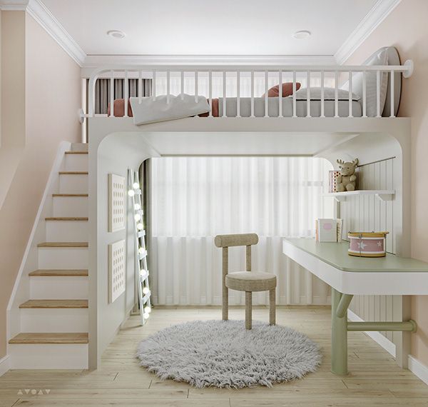 With a single purpose-built bed and storage loft, not a single space is wasted in this small bedroom. The raised area and high shelving create dedicated sleeping space with ample under-bed storage; even the steps are used for storing treasures.
