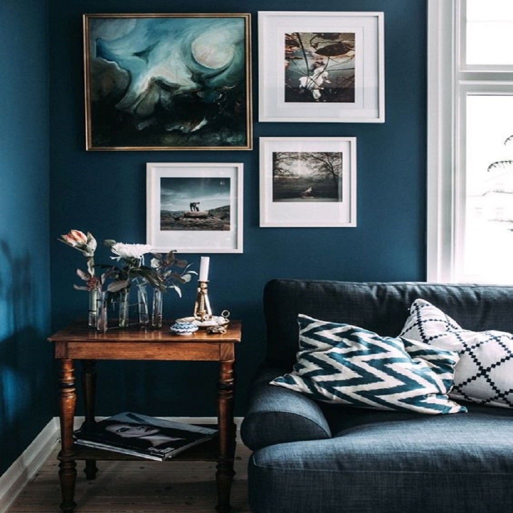 Deep royal blue has its place throughout this living room, from the walls, to the couch, the color of the ocean is present. The wooden side table brings contrast to the rest of the living room, the paintings with white borders do the same. This design would be perfect for the artists or art connoisseurs alike.