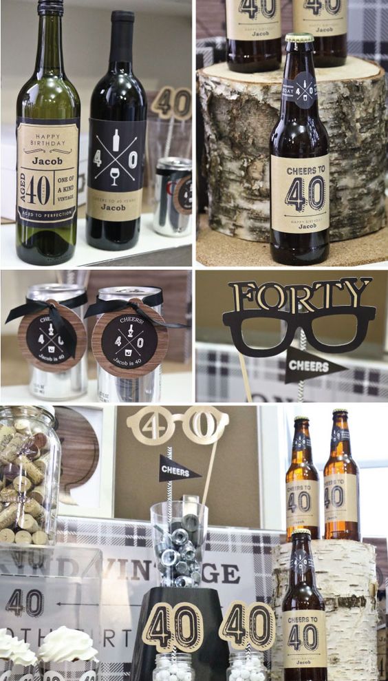 Alcohol-themed 40th birthday parties are popular since it knows no gender or interest. There are lots of available neutral-colored printables available that can be customized to include the celebrant’s name and other details. Toppers, banners or tarps, tags, and even stickers can be printed to create a cohesive look to the entire party.